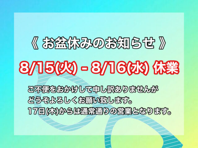 お盆休みの営業について。 お知らせ 投稿日| 2023.08.07 最終更新日| 今年は8/15(火)・8/16(水)と連休をいただきます。 8/17(木)からは通常営業。 メガネの調整・クリーニングも承りますので気軽にお立ち寄りください。 皆様のご来店、お待ちしております。
