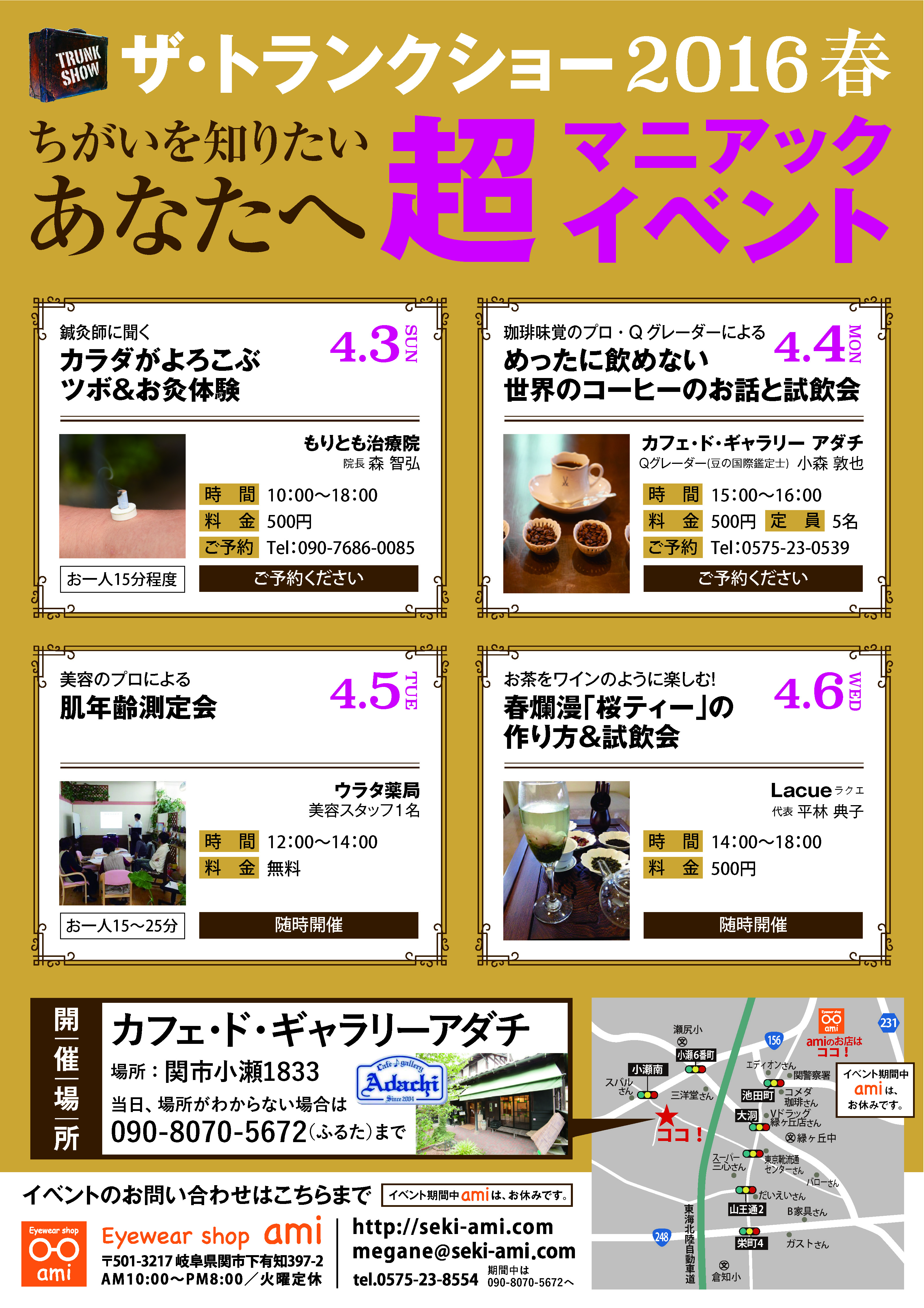 前回に引き続き、今回のコラボトランクショーは関市の銘店「カフェ・ド・ギャラリーアダチ」さんにて開催します。
