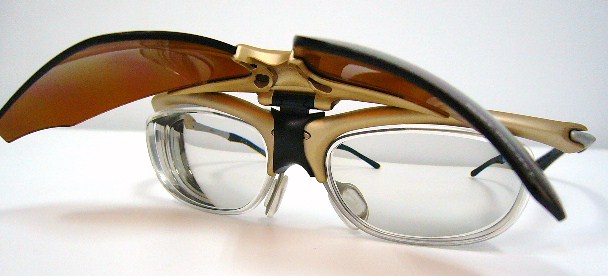 跳ね上げた状態です。運転時のトンネル内など、ワンアクションでメガネとサングラスを使い分けれるところが、跳ね上げの最大の魅力でしょうね。